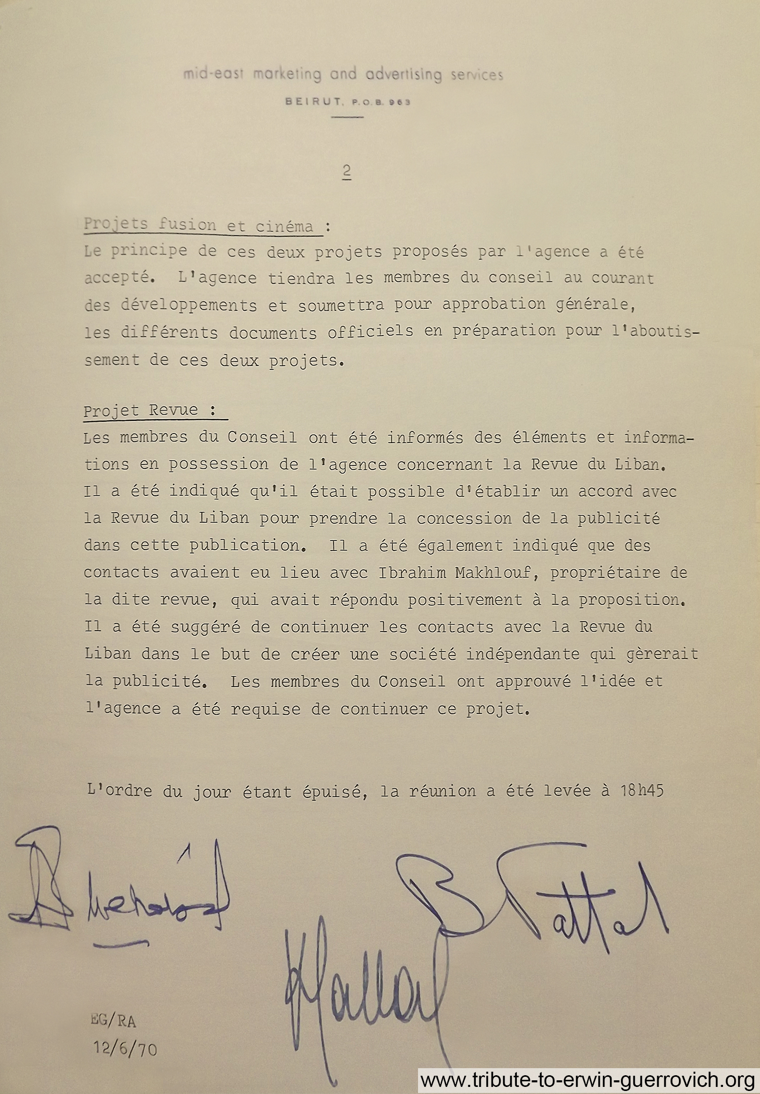 Le Conseil d’Administration de MEMAS s’est réuni le Lundi 6 Juillet, 1970. Étaient présents MM. G. Fattal, E. Guerrovich, B. Fattal, K. Fattal. La séance fut ouverte à 17h00, avec l’agenda suivant: