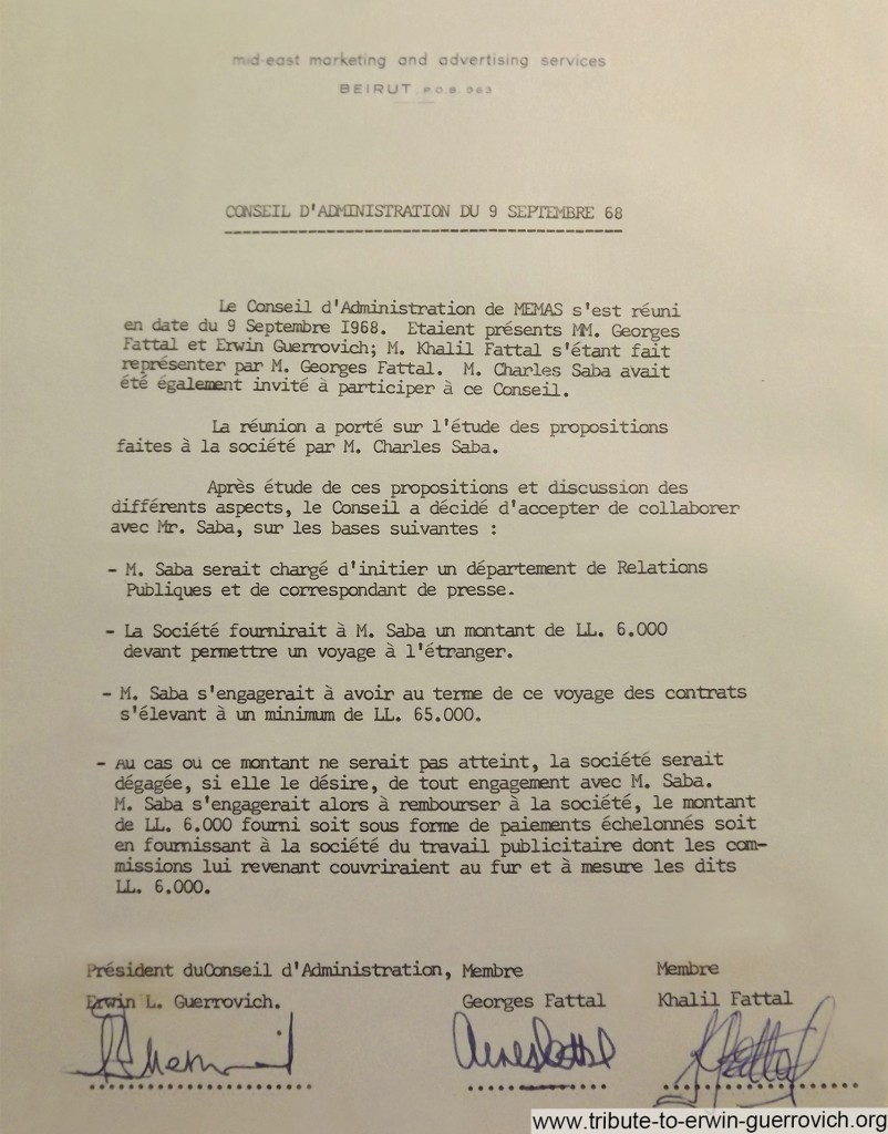 MEMAS Board meeting dated September, 9 1968. MEMAS was to become Intermarkets Advertising on January, 1 1970. Texte du document: mid east marketing and advertising services BEIRUT, p o b. 963 CONSEIL D’ADMINISTRATION DU 9 SEPTEMBRE 68 Le Conseil d’Administration … Continue reading
