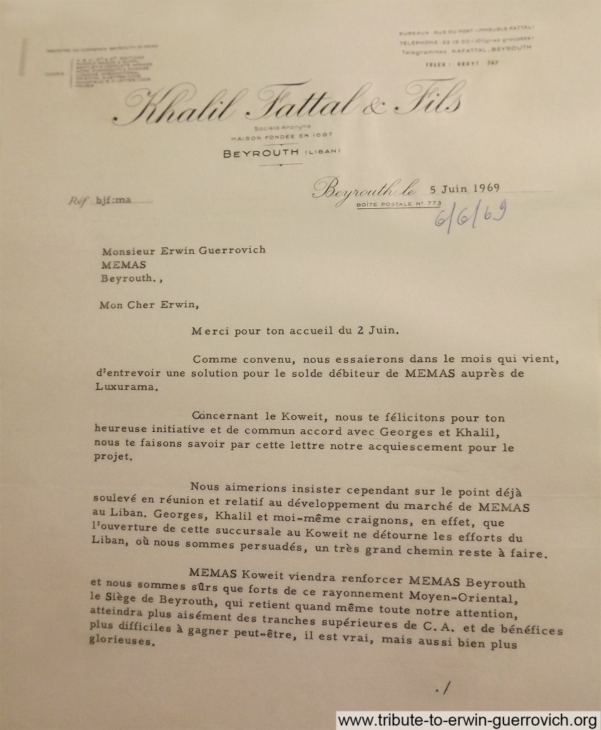 Texte du document Khalil Fattal & Fils Société Anonyme Maison fondée en 1897 BEYROUTH (LIBAN) Beyrouth, le 5 Juin 1969 Boite postale N773 Monsieur Erwin Guerrovich MEMAS Beyrouth., Mon Cher Erwin, Merci pour ton accueil du 2 Juin. Comme convenu, … Continue reading